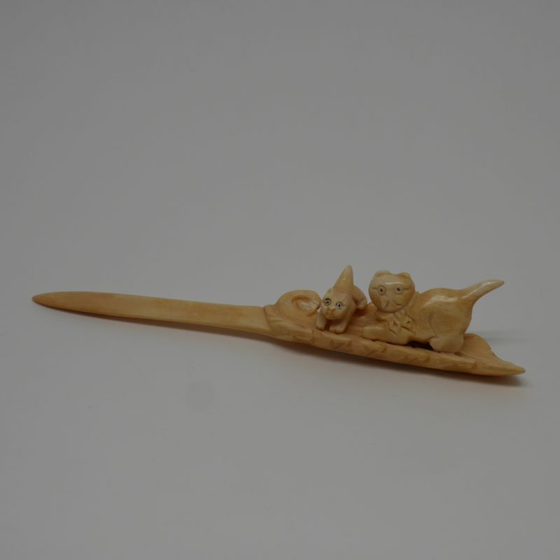 Abrecartas de hueso tallado a mano con relieve de dos gatos