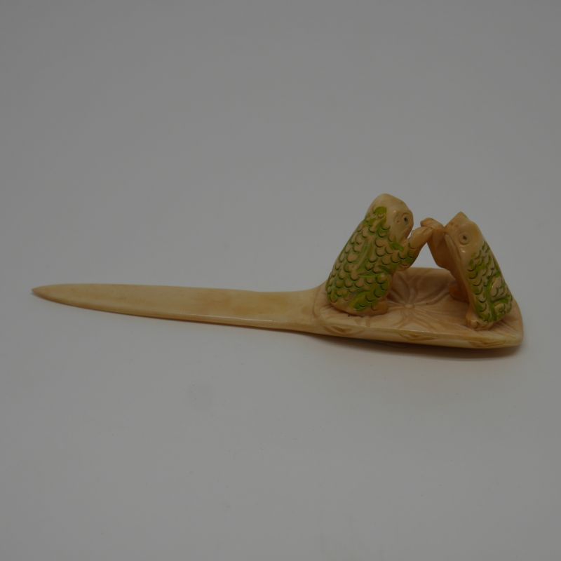 Abrecartas de hueso tallado a mano con relieve de dos ranasAbrecartas de hueso tallado a mano