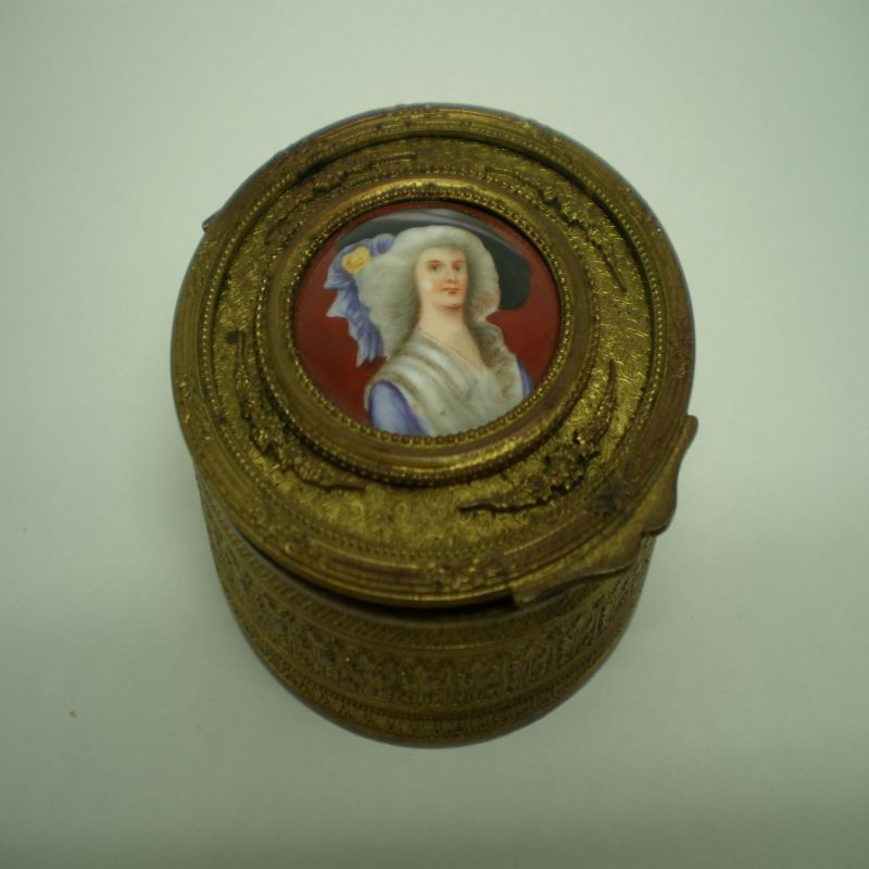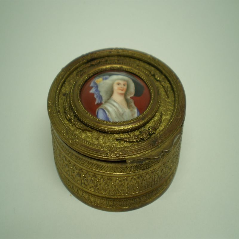 Caja antigua de latón y esmalte redonda con relieves