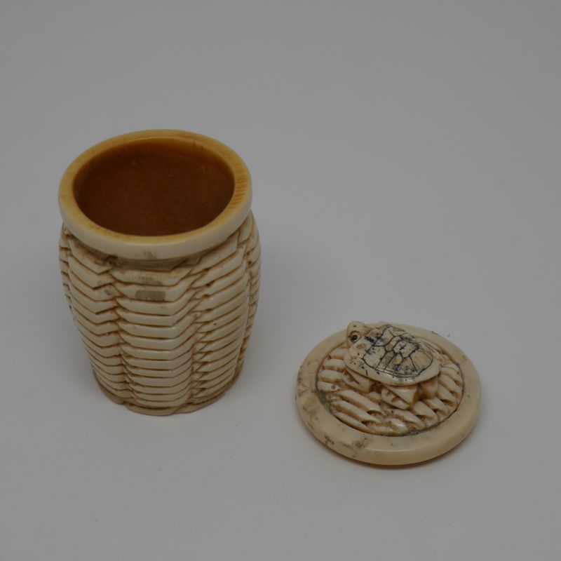 Caja de hueso fabricada a mano en forma de tibor con relieve de tortuga