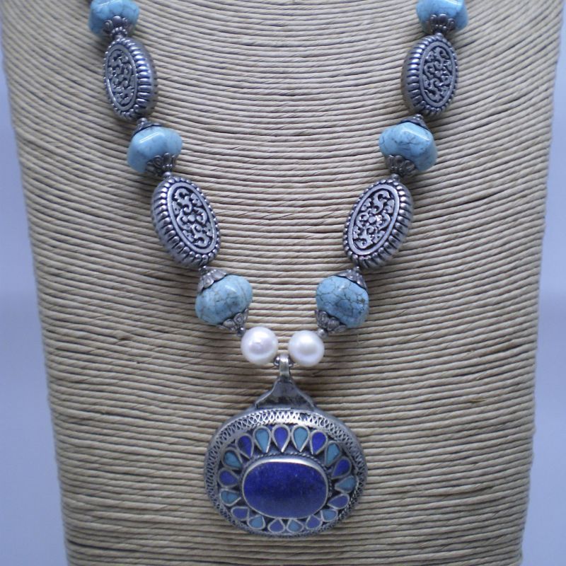 Collar afgano de alpaca con 6 turquesas y centro de lapislazuli