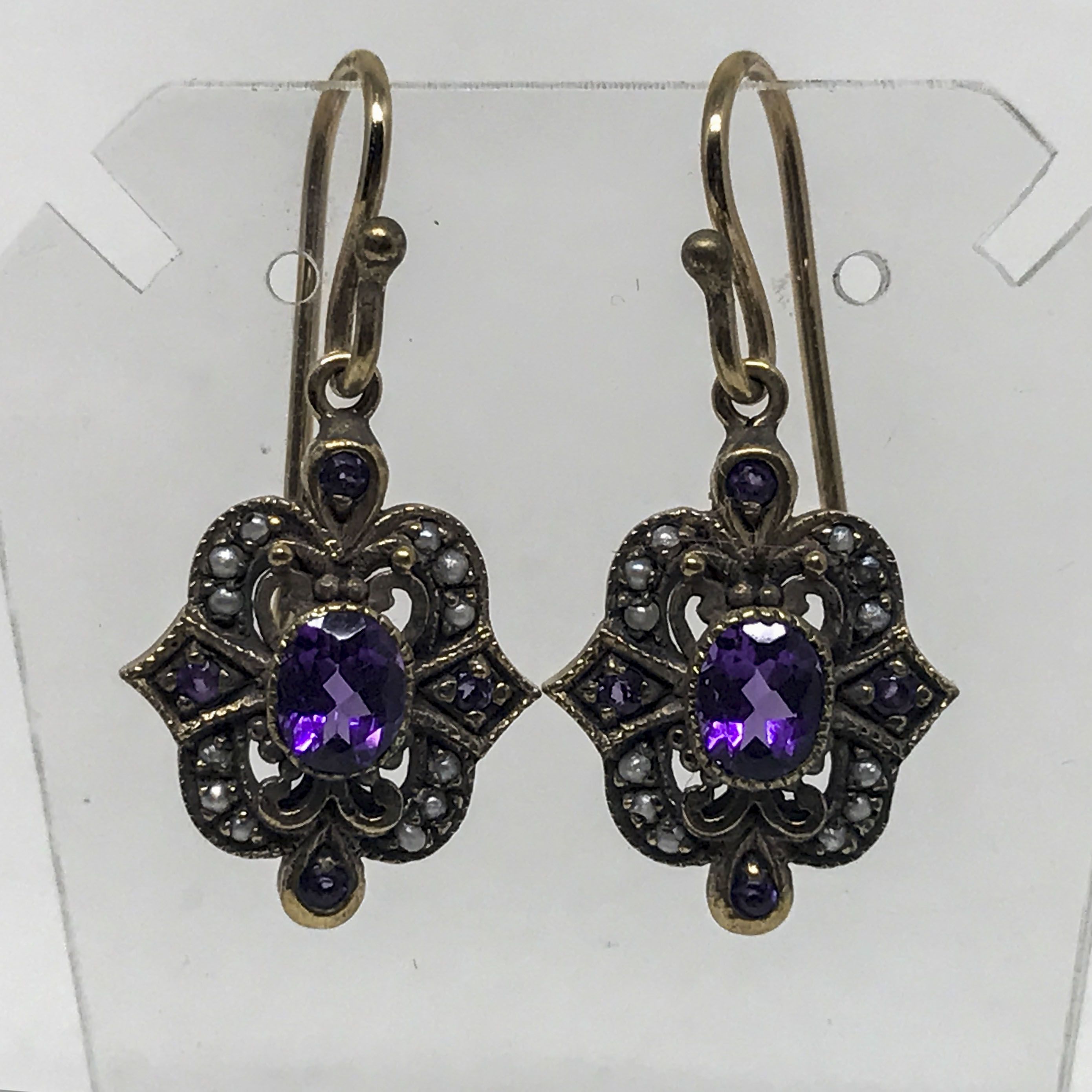 Pendientes largos de oro bajo 9 K. con amatistas y perlitas