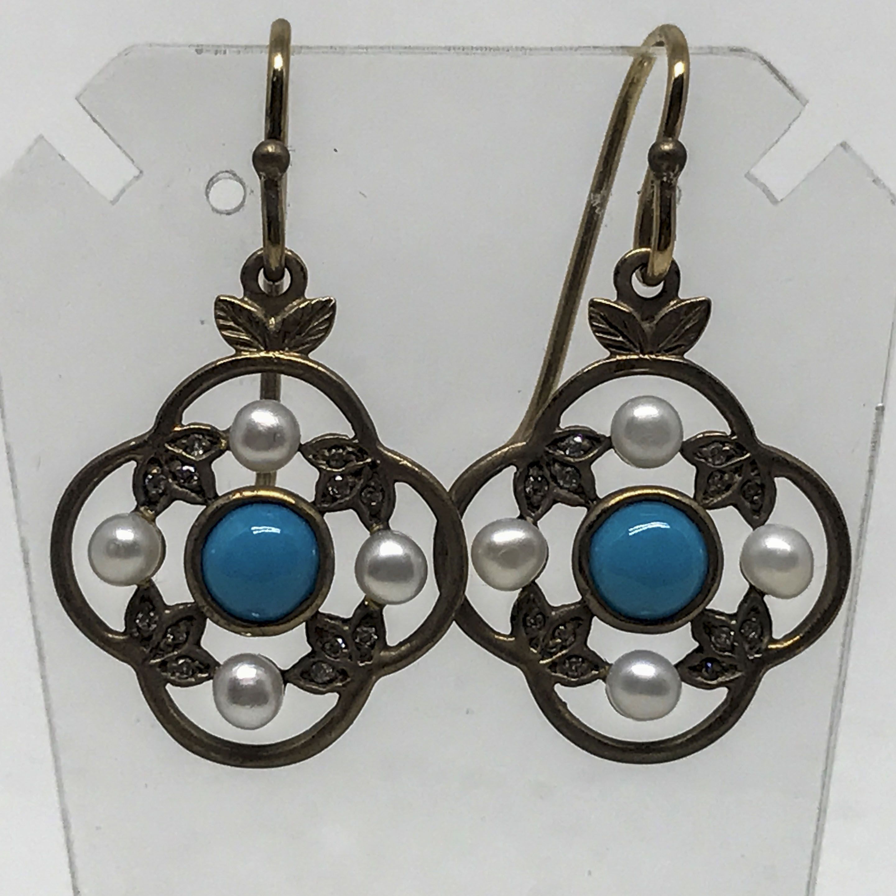 Pendientes de oro bajo 9 K. con diamantes, perlitas y turquesa