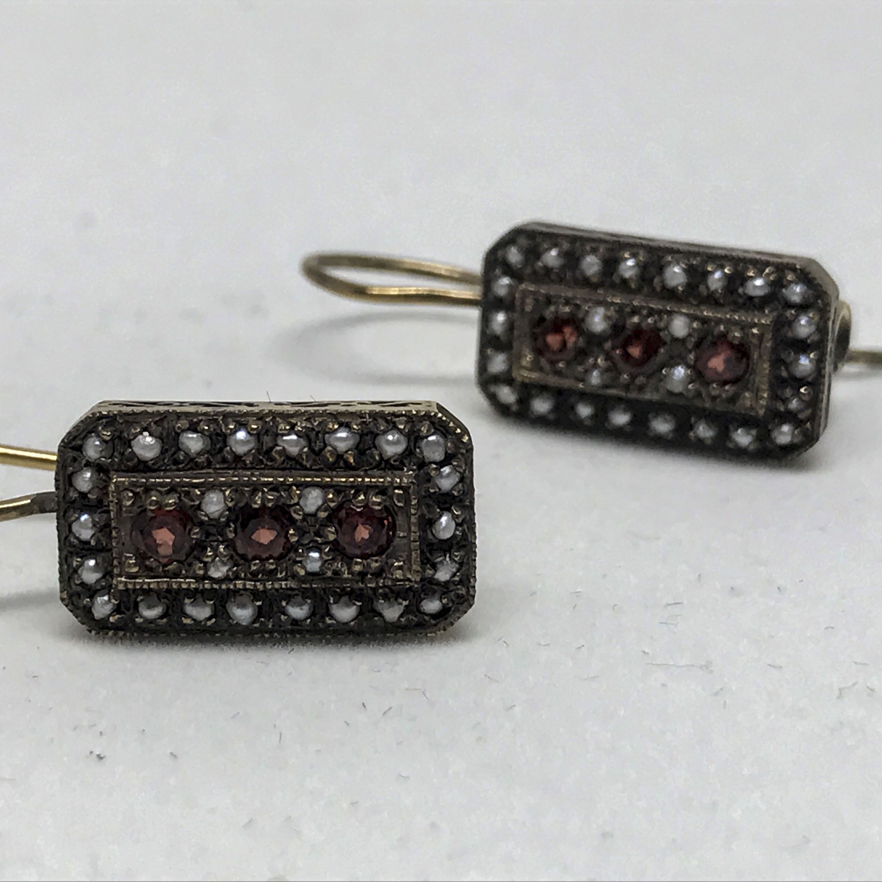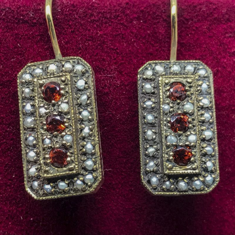 Pendientes largos de oro bajo 9 K. con granates y perlitas