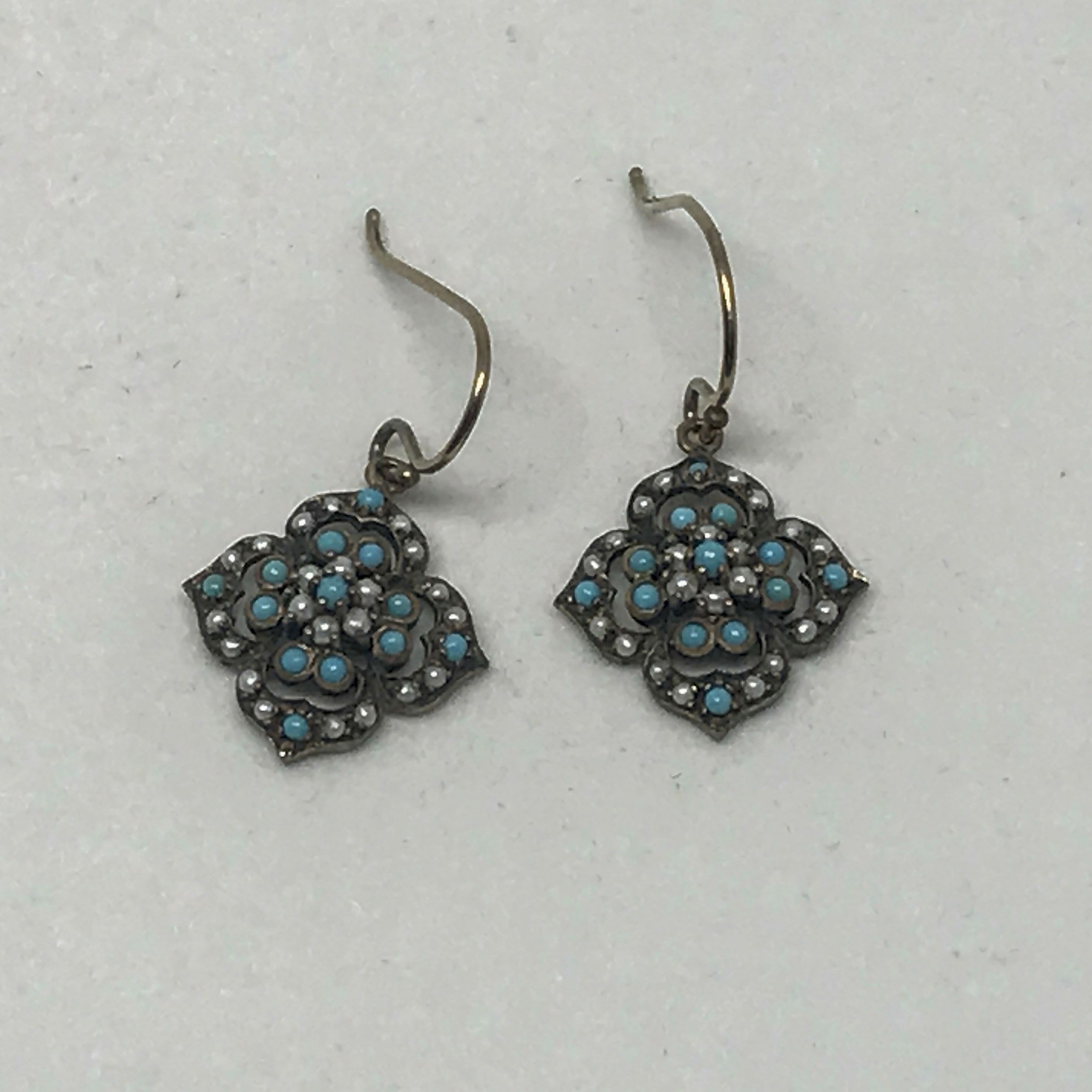Pendientes largos de oro bajo 9 K. con turquesas y perlitas