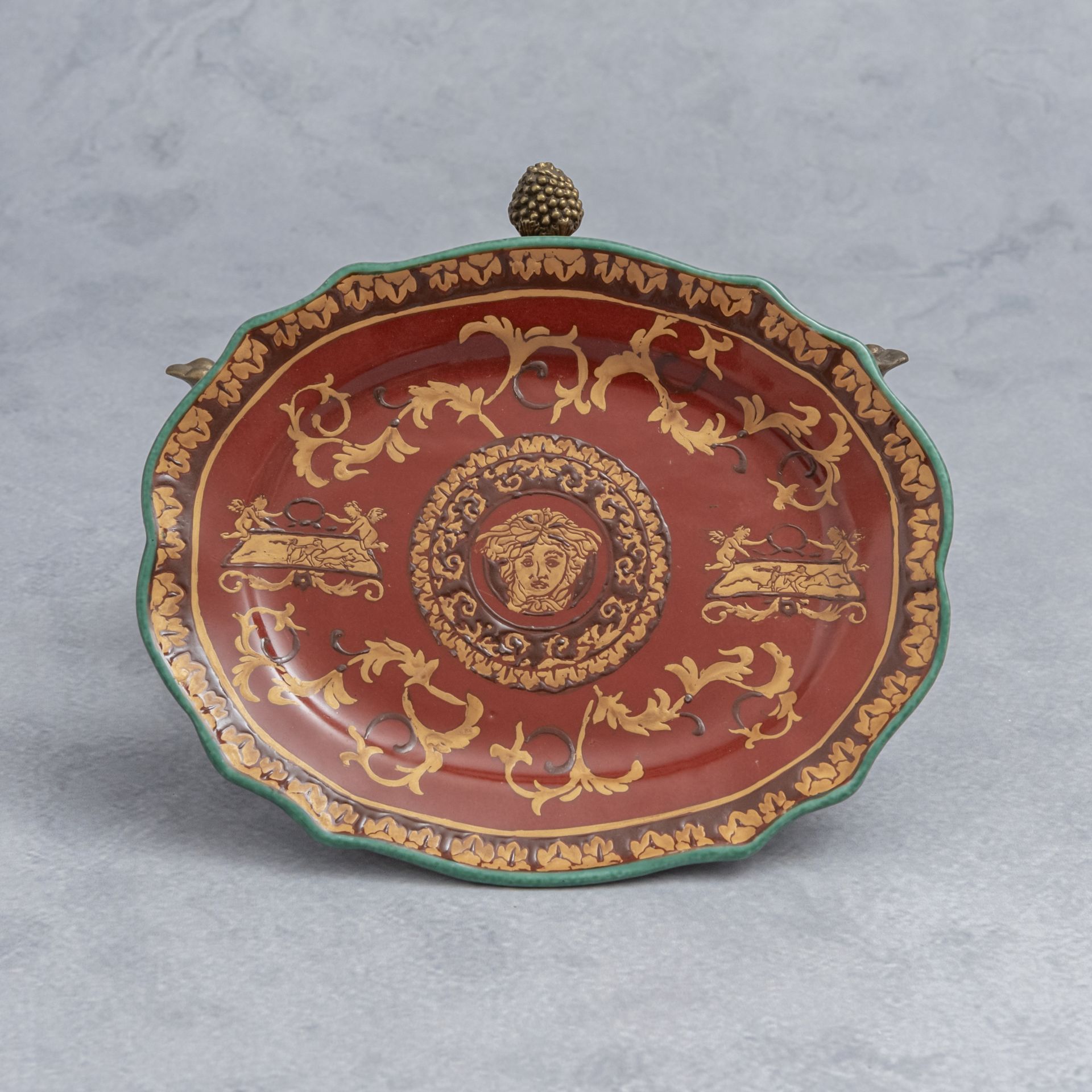 Pequeña Sopera China de Porcelana y Bronce Adele Carey sobre fondo rojo