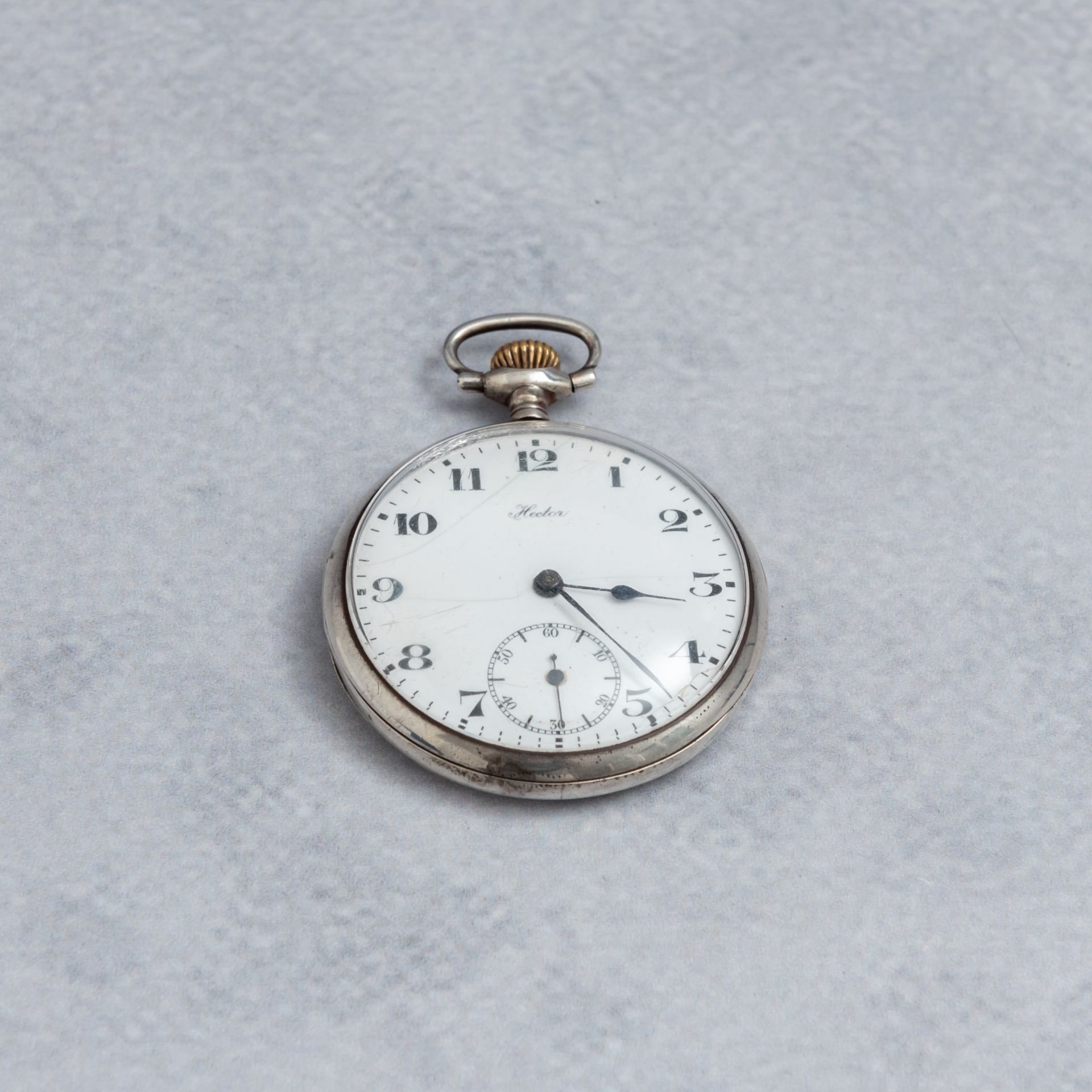 Reloj de bolsillo a cuerda antigüo de plata de ley marca Hector en estado de marchaReloj de bolsillo antigüo a cuerda de plata de ley, marca Hector