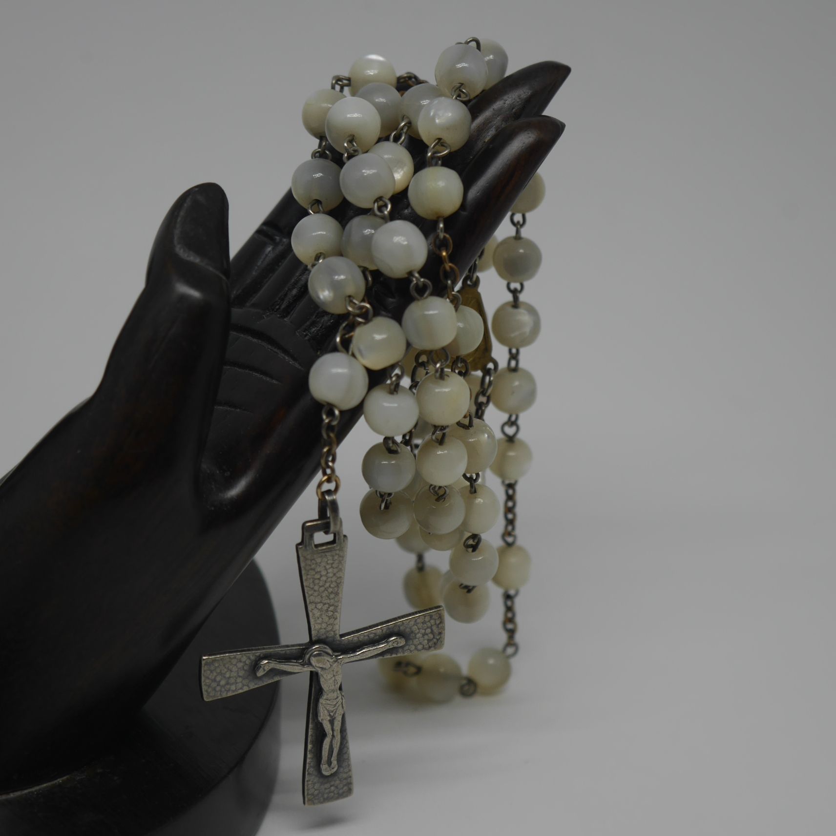 alt="Rosario antiguo de nacar y metal plateado. www.santelmotienda.com"Rosario antiguo de Nácar y Metal Plateado